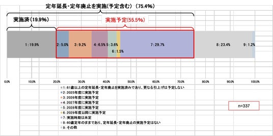 ●定年延長予定は、「実施済」19.9%と「実施予定(時期未定含む)」55.5%の合計で75.4%を