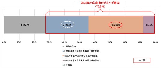 ●2026年の初任給の引上げ意向は、「2025年並みの水準」が36.2%で最も高く、次いで「2025年