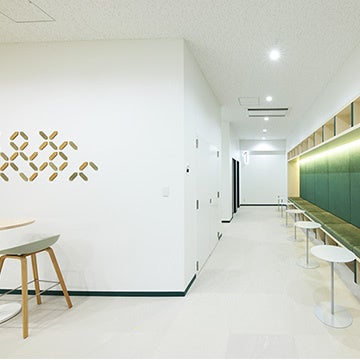 全長約280mという施設の特性に合わせ、1階それぞれの専有部の事務所横にラウンジと給湯スペースを配置しました。入居企業スタッフの移動負担を避けるべく、共用ラウンジはあえて設けず、来客対応や休憩に適した環境を各区画内で完結できるよう整えました。