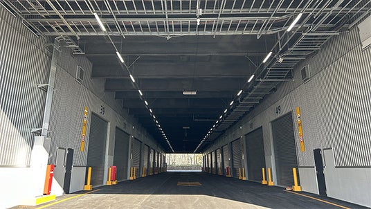 1・2階を縦に一体利用できるメゾネット型の物流施設で、高い保管効率を実現しています。荷物用エレベーターを備え、迅速な荷捌きを可能にするとともに、将来的には垂直搬送機の追加にも対応可能です。1階には建物内部を通る2つの車路に沿って着車できる高床式トラックバースを設け、天候に左右されないスムーズなアクセスと荷捌きをサポートします。さらに、敷地内動線は全ルートを一方通行を基本とし、安全性と機動性の向上を図ります。