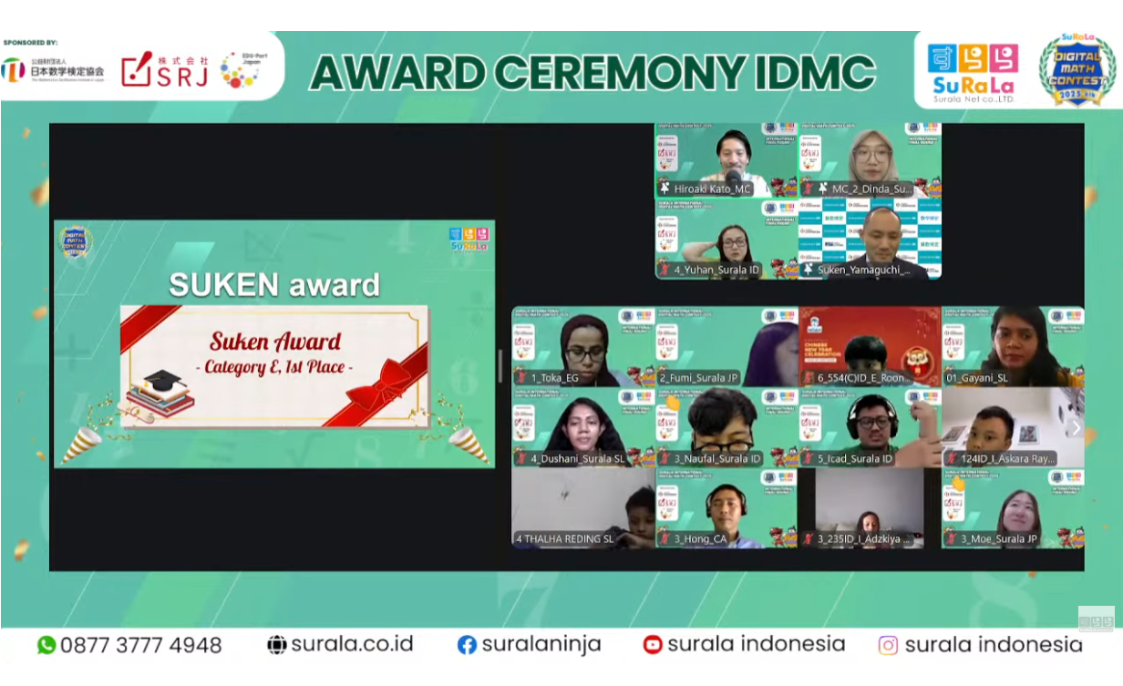 また、数検の英語版の問題を提供した「算数/数学テスト」の最上位学年である中学校2年生部門の優勝者には、当協会から賞として「SUKEN Award」を贈呈いたしました。受賞したインドネシアの中学校2年生の生徒は、昨年に続き2年連続での受賞となりました。