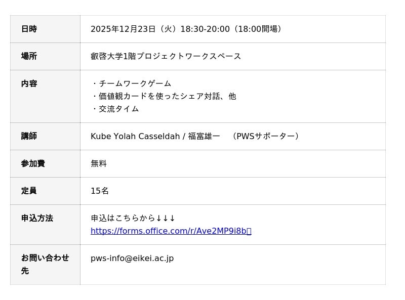 叡啓大学(学長:有信睦弘、広島市中区)は、2025年12月23日(火)、叡啓大学のプロジェクトワークスペースにて、PWS月次イベント:「はたらく/チームワーク」に関して英語で対話しようin 広島」を開催します。