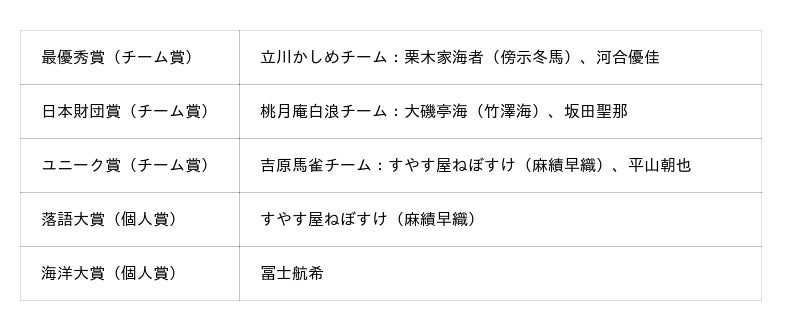 高校生たちの発表は、プロの落語家や海洋の専門家など4人の審査員によって、「表現力」「おもしろさ」「研究の深度」「発想力」といった視点から講評が行われ、厳正な審査の結果、「マイクロプラスチックと海洋生物」をテーマに海落語とプレゼンテーションを披露した、立川かしめチームの栗木家海者(傍示冬馬)さんと河合優佳さんが最優秀賞を受賞しました。