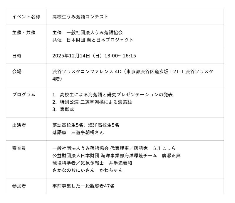 一般社団法人うみ落語協会は、日本の伝統文化である落語の“笑い”と、環境専門家によるトークを通じて、海の現状を楽しく学べる「海の落語プロジェクト」を推進しています。このたび、2025年12月14日(日)、渋谷ソラスタコンファレンス(東京都渋谷区)にて、「高校生うみ落語コンテスト」を開催しました。「高校生落語プログラム」に参加した10人の高校生が、約半年をかけて作り上げた海落語とプレゼンテーションを披露し、会場は笑いと熱気に包まれました。