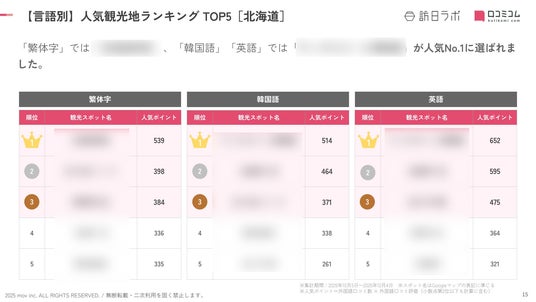 業界最大級のインバウンドビジネスメディア「訪日ラボ」及び 店舗向け集客一元化プラットフォーム「口コミコム」を運営する株式会社mov(代表取締役:渡邊 誠、本社:東京都渋谷区、以下mov)は、北海道の観光地に寄せられた最新の口コミデータから、独自の『インバウンド人気観光地ランキング』を発表しました。