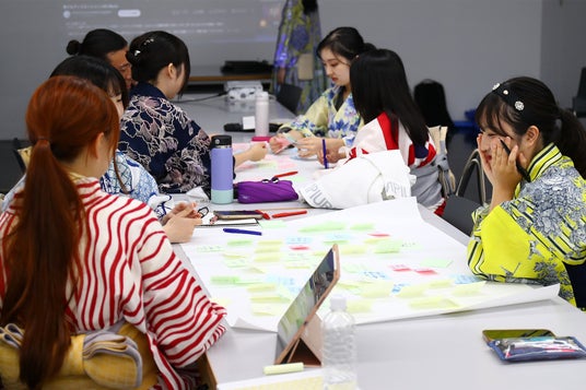 本プロジェクトは、きものが受け継いできた「物質的な循環」と「物語の継承」の二つの価値に着目し、伝統を尊重しながら現代のライフスタイルへつなぐ“未来のきもの”の姿を探るものです。本学の学生20名が4グループに分かれ、清水恒平教授(基礎デザイン学科)が担当し、新しいデザイン提案、素材研究、空間・体験設計など、多角的なアプローチによるプロトタイプ制作を行いました。