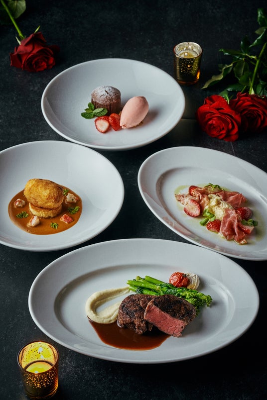 欧米では男性がパートナーにディナーやプレゼントを贈る風習が残るバレンタインデー。そんな映画のようなワンシーンを叶える3日間限定のディナーをご提供いたします。ロマンティックなひとときを過ごしたいゲストに最適なこの「バレンタインコース スペシャル」は、赤くジューシーないちごに、生ハム、クリーミーな味わいのフレッシュチーズのストラッチャテッラを合わせた前菜から始まります。愛らしいビジュアルの前菜は、いちごの甘みと生ハムの塩味が調和し、軽やかで奥行きのある味わいをお楽しみいただけます。続く一皿には、サクサクとした食感に仕上げたロブスターのクロケット(コロッケ)に、ビスクソースを合わせた贅沢な料理をご用意。ロブスターの旨味がぎゅっと詰まった濃厚なコクが広がる一品です。メインには、赤ワインとダークチョコレートでつくる自家製ソースを添えたテンダーロインステーキが登場いたします。チャコールグリルで丁寧に焼き上げるステーキは、ステーキハウスならではの香ばしさと旨みが引き立ち、肉本来の上質な味わいを存分にご堪能いただけます。そしてコースの最後にご提供する、温かいチョコレートがとろりと溶け出るチョコレートフォンダンのデザートが、ロマン ティックディナーを締めくくります。また、ホテルソムリエがこのディナーコースのために厳選したシャンパンとワインのペアリングオプションもご用意し、ディナーをさらに豊かな時間へと導きます。