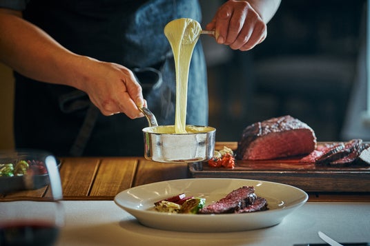 「シェフズ カービング ディナーコース」では、チャコール(炭)グリルで絶妙に火入れをした、宮崎牛をはじめとする、その日もっとも状態の良いA5ランク黒毛和牛のローストをお召し上がりいただけます。ダイナミックに焼き上げた塊肉は、シェフ自らがゲストの目の前でカービング。ナイフを入れると、熟練の技で仕上げたロゼ色の美しい断面があらわれ、炭火ならではの芳ばしい香りや、脂の甘みをほのかに感じる芳香がテーブルに広がります。ライブ感あふれるパフォーマンスとともに、五感を刺激する新たな食体験をぜひご堪能ください。まずは何も付けずに肉本来の味わいを満喫したあと、赤ワインソースとグリーンペッパーソース、2種類の自家製ソースで味の変化をお楽しみいただくのがシェフのお勧めです。付け合わせには、グリルした冬野菜とアリゴポテトをご用意いたします。アリゴポテトは、きめ細かく滑らかな口当たりに仕上げる自家製マッシュポテトに、ストラッチャテッラとゴーダ、2種類のチーズを合わせた濃厚な味わいで、ワインやビールが思わずすすむ一品です。