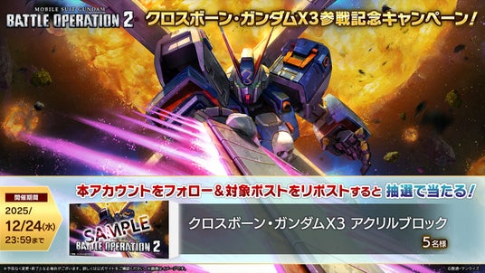 『バトオペ2』 への「クロスボーン・ガンダムX3」実装を記念して、公式Xでキャンペーンを実施中です。 『バトオペ2』公式Xをフォロー&キャンペーン投稿をリポストすることで応募が完了いたします。