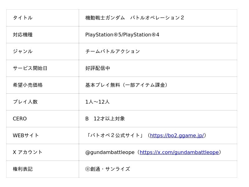株式会社バンダイナムコエンターテインメントは、PlayStation(R)5/PlayStation(R)4向けオンライン専用ゲーム『機動戦士ガンダム バトルオペレーション2』 (以下、『バトオペ2』)にて、