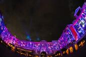 夜になると、東京ディズニーシー・ホテルミラコスタの壁面に映像が映し出され、25周年のテーマソング「Come Join the Jubilee(カム・ジョイン・ザ・ジュビリー)」にのせてきらめきにあふれた世界が繰り広げられます。
