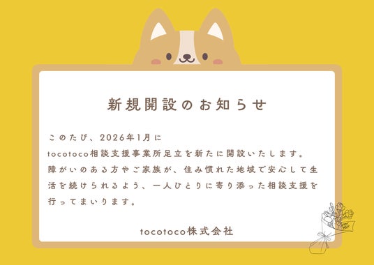 tocotoco株式会社(所在地:東京都千代田区、代表取締役:山本裕貴)は、地域に根ざした支援体制の強化を目的として、2026年1月東京都足立区に「tocotoco相談支援事業所足立」を新たに開設いたします。