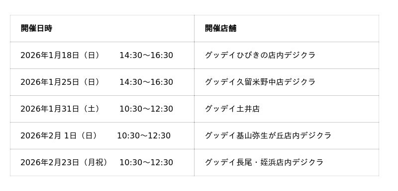 また、購入前後の不安を解消するため「スタートアップ講座つき3Dプリンター即売会」をグッデイデジタルクラフトスタジオ(長尾店・姪浜店・久留米野中店・ひびきの店・基山弥生が丘店)およびグッデイ土井店にて順次実施、レクチャー体制も強化します。