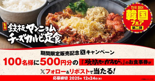 株式会社物語コーポレーション(本社:愛知県豊橋市/代表取締役社長:加藤 央之)が全国35店舗を展開する、「焼きたてのカルビ丼」と「ユッケジャンスープ」の専門店『焼きたてのかるび』は、韓国フェア第2弾「ヤンニョムチーズカルビ丼」などの販売を記念して、2025年12月18日(木)より、公式Xフォロー&リポストキャンペーンを実施いたします。
