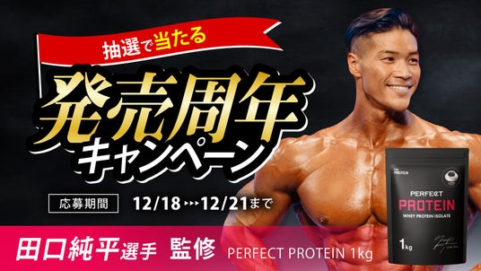 武内製薬株式会社が製造・販売を行うプロテインブランドのTHE PROTEIN(通称:ザプロ)は、2023年1月より田口純平選手とスポンサー契約を結び、プロテインおよびEAA、サプリメントなどの提供や、田口純平選手が完全監修する"PERFECTシリーズ”の製造・販売を行なってきました。田口純平選手の監修商品第一弾としてPERFECT PROTEINが販売されてから約2年が経ち、日ごろの感謝の気持ちを込めて、この度抽選で商品が当たるキャンペーンを開催することが決定いたしました!