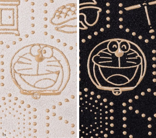 艶やかな鹿革の上に、『ドラえもん』やひみつ道具のモチーフを立体感のある漆であしらい、さりげない遊び心をプラス。上質さの中にユーモアが光る、大人のための一品です。