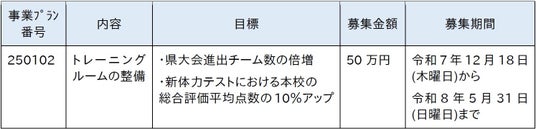 県立新羽高等学校は、令和8年度に創立50周年を迎えます。50周年記念事業として、寄附金を活用して、トレーニングルームを整備します(新たな器具の購入や床の改修など)。これにより、運動部の競技力を向上させることで、県大会進出チームを増やし、生徒のリーダーシップ育成につなげます。また、トレーニングルームを授業等でも活用することで、生徒の運動能力や筋力の向上につなげ、新体力テストにおける本校の総合評価平均点数の10%アップを目指します。