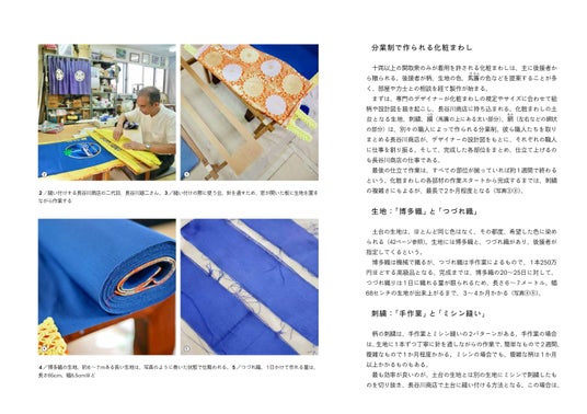 化粧まわしの仕立て職人(長谷川商店)、京友禅の老舗(株式会社千總)、締め込みの織物工房(株式会社錦旗)の製作現場を見学。化粧まわし、染め抜き着物、締め込みが仕上がるまでの過程や技術、職人のこだわりなど、一般には知り得ない製作の舞台裏を、事例とともに紹介する。