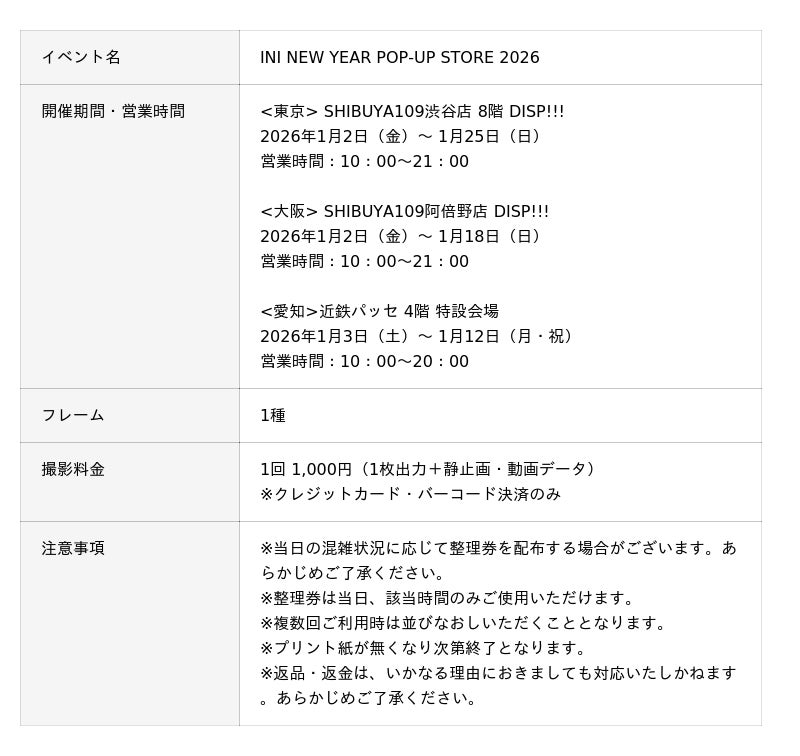 キタムラ・ホールディングス グループのピックハイブ株式会社(本社:東京都新宿区、代表取締役社長 兼 COO:大迫 由典)が運営するセルフフォトブランド「Photomatic(読み:フォトマティック)」は、2026年1月2日(金)からSHIBUYA109で開催される大人気ボーイズグループ「INI」のポップアップストア『INI NEW YEAR POP-UP STORE 2026』の東京会場・大阪会場・愛知会場にて、本イベント限定のコラボレーションフレームで撮影できるセルフフォトブースを設置いたします。