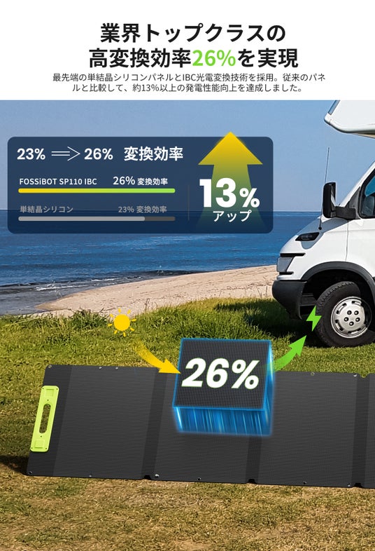 本製品は、最先端の単結晶シリコンとIBC(バックコンタクト)光電変換技術を採用し、業界トップクラスとなる最大26%の高変換効率を実現。