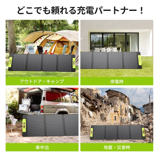USBポートを標準装備し、ポータブル電源だけでなく、スマートフォンやタブレットなどへの直接充電が可能。付属の「4in1 MC4充電ケーブル」は、市販のほとんどのポータブル電源に接続できる高汎用性設計です。