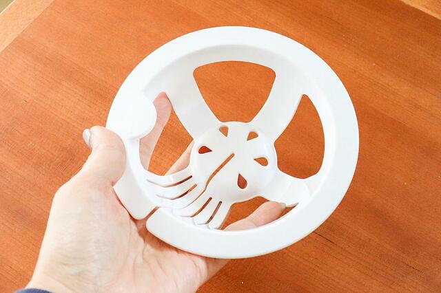 カゴの代わりにしては、かなり穴が大きめ。切り込みが入っている部分もあって、特徴的な形をしています。
