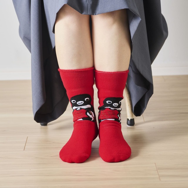 おうち時間が楽しくなる裏起毛ルームソックスは、赤色をベースカラーに、編み物をしているSuicaのペンギンをデザインしたものと、青色をベースカラーに、温泉であたたまったSuicaのペンギンと子ペンギンが描かれた楽しいデザインです。