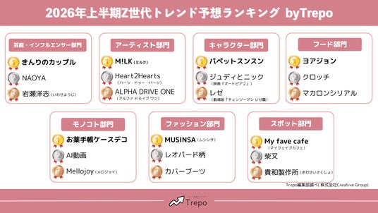 株式会社Creative Group(本社:東京都千代田区、代表取締役:中原一真)が運営する10代~20代女性向け『トレンドメディアTrepo(トレポ)』は、10代~20代の女性(Trepo girls)を対象に、2026年上半期のZ世代トレンド予想調査を行いました。WEBで実施したアンケート調査(以降「Trepo girls調査」)の結果をお知らせします。