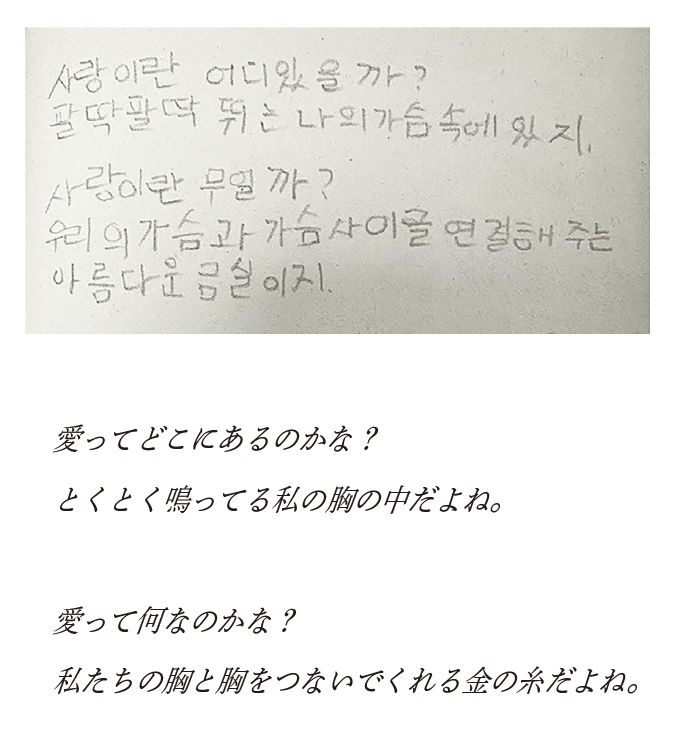 『光と糸』は、最終ページにカラーで収録された、ハン・ガンさんが8歳の時に書いた詩を起点に、光と愛をめぐって、著者自らが一冊の「作品」として作り上げました。