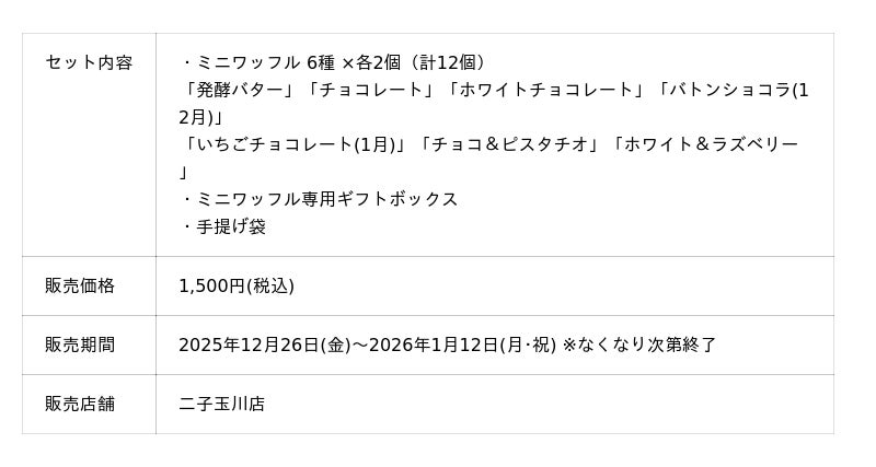 人気のミニワッフルに加え、12月から登場したミニワッフル&デコもセットに。華やかでかわいらしい見た目で、年末年始の集まりにもぴったりです。