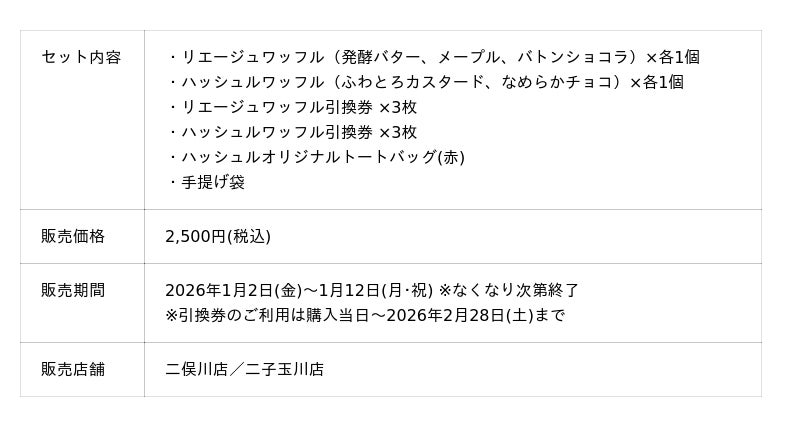 ハッシュルの定番ワッフル5種に、季節限定商品も交換可能なワッフル引換券、ハッシュルオリジナルトートバッグ(赤)がセットになっています。