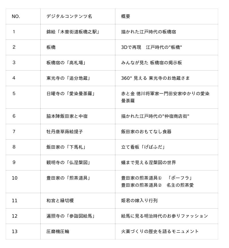 デジタル上に再現されるのは、日曜時の「赤と金 徳川将軍家一門の田安家ゆかりの愛染曼荼羅」や東光寺の「360°見られるお地蔵さま」など、板橋宿の歴史・文化を物語る多彩なデジタルコンテンツが揃っています。なかでも、「江戸時代の"板橋"の3D再現」は初の試みです。