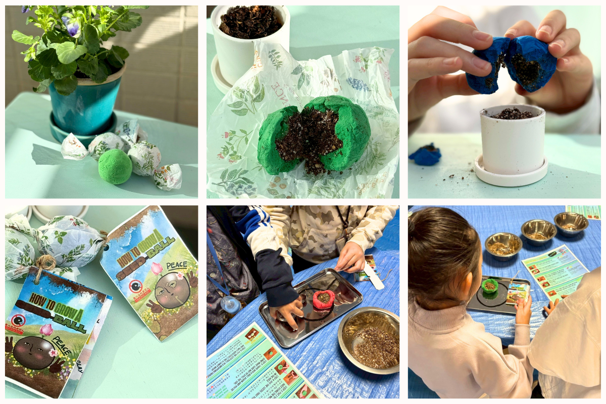 小学生チームがニュージーランドの高校生チームの活動にインスパイアされ、発案したフラワーボール。カラフルな粘土や好きな花の種を選び、楽しく制作できるワークショップが好評です。 ※フラワーポットはワークショップではお配りしておりません。ご了承ください。