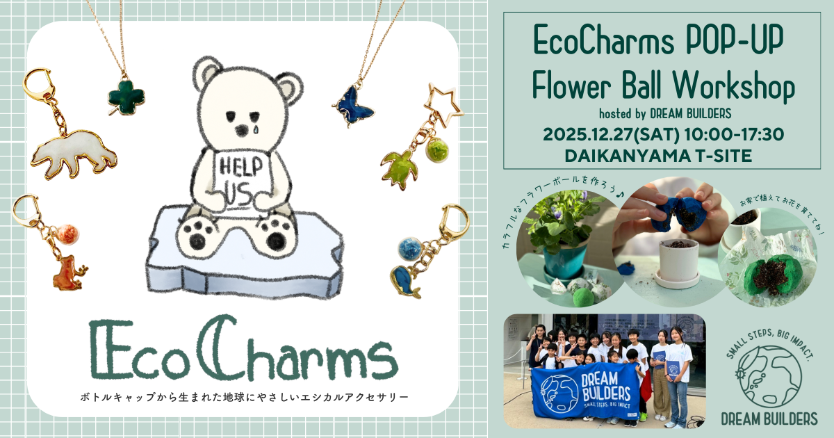 2025年12月27日(土)、小中学生環境保護活動チームDREAM BUILDERS(ドリームビルダーズ/東京都・総代表 沖田美怜)は、代官山T-SITEメインストリートにて、ペットボトルのふたを再利用したアクセサリー「EcoCharms(エコチャームズ)」のPOP UP販売と、親子で楽しめる「五感で楽しむFlower Ball(フラワーボール:花の種と土が入ったボール)づくりワークショップ」を開催します(10:00~17:30)。