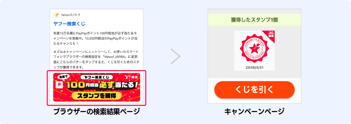 本キャンペーンでは、スマホブラウザーの検索エンジンを「Yahoo! JAPAN」に設定し、ブラウザーの検索窓(アドレスバー)から「ヤフー検索くじ」と検索するとスタンプが獲得でき、くじ引きに参加できます。先着で100円相当のPayPay ポイントが必ずもらえるほか、抽選で最大10,000円相当のPayPayポイントが当たるなど、総額1,000万円相当の景品を用意しています。