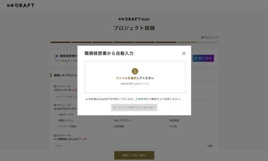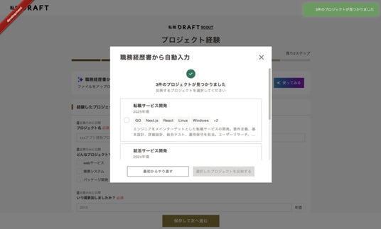株式会社リブセンス(代表取締役社長:村上太一、本社:東京都港区、証券コード:6054)が運営する『転職ドラフト』(URL:https://job-draft.jp/) は、「職務経歴書インポート機能」を新たに導入しました。本来、職務経歴書は自由形式ですが、本機能においてはユーザーが作成した職務経歴書またはスキルシートのPDFファイルをAIが解析し、転職ドラフトのプロフィール作成に必要な項目を抽出、インポートできるようになりました。