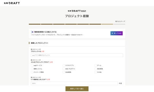 転職ドラフトでは、会員登録のプロフィール作成の際にプロジェクト経験の登録が必須となっており、より具体的な内容の記述が求められます。これはスカウト時に年収を提示するという独自のシステムに因るもので、同時に会員登録のハードルの高さに繋がっていました。