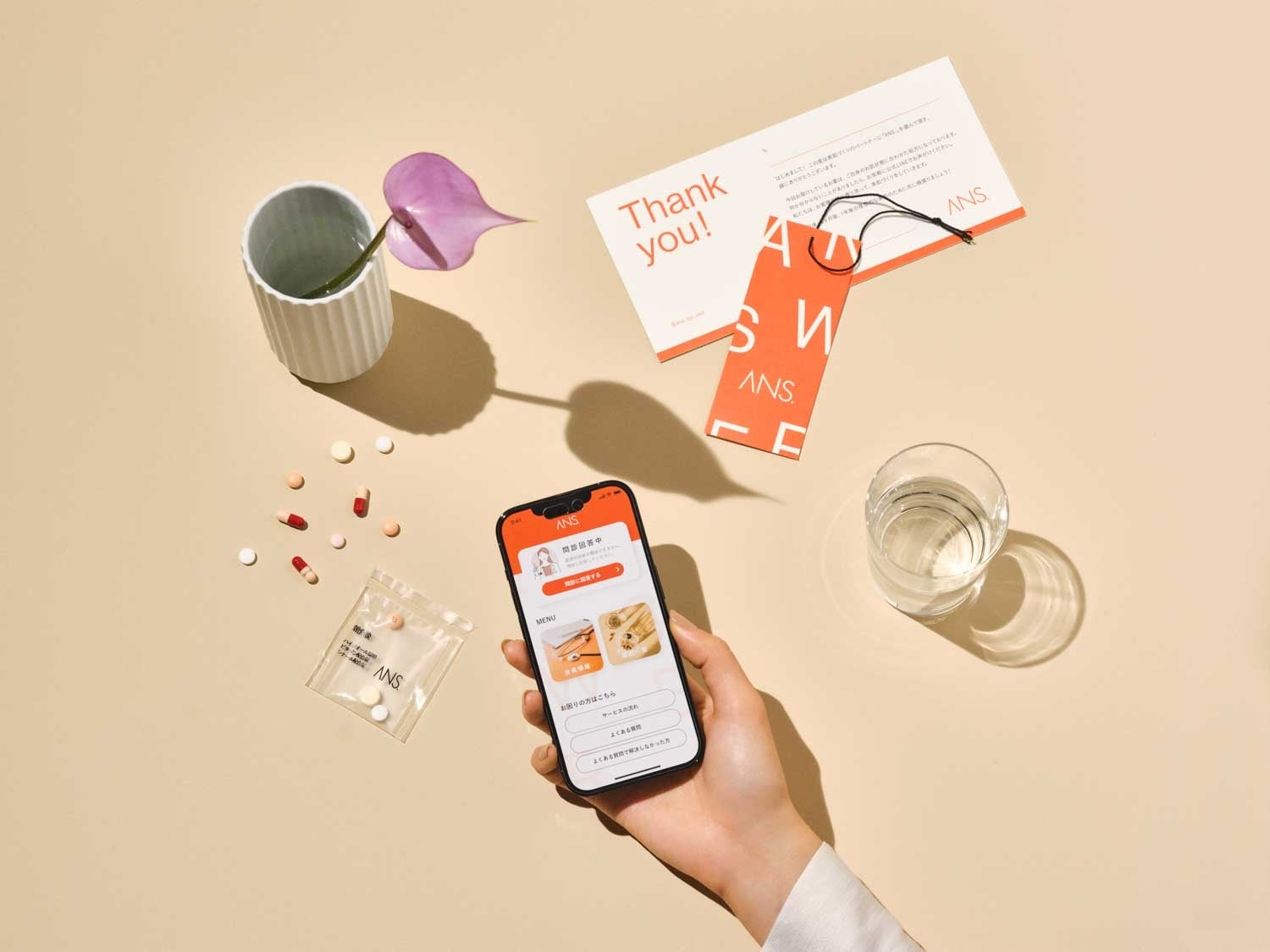 「ANS.」は、自宅で叶うオンライン肌管理サービスです。スマホ一つで医師によるオンライン診療を受けていただき、ユーザー1人ひとりの肌悩みや目指したい肌に応じたお薬や基礎化粧品、サプリメントを、毎月ご自宅にお届けするのが特徴です。