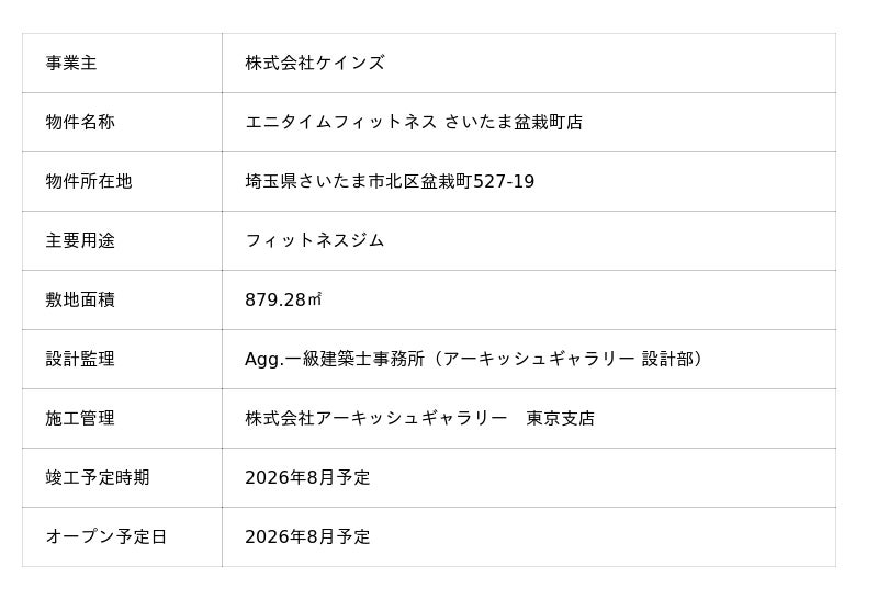 当社子会社である株式会社アーキッシュギャラリー(本社所在地:名古屋市中区、以下「アーキッシュギャラリー」)が設計・施工を手掛ける『エニタイムフィットネス さいたま盆栽町店』(以下、「本物件」)が着工いたしましたのでお知らせいたします。