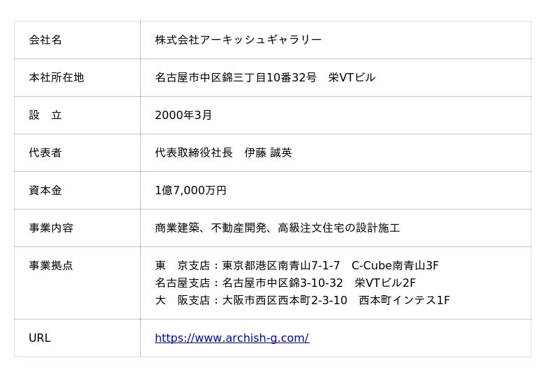 当社子会社であるアーキッシュギャラリーは東京・名古屋・大阪を中心に、商業建築・不動産開発・高級注文住宅の企画・設計・施工を行う総合建設会社です。鉄筋コンクリート造・重量鉄骨造を得意とし、国内外の自動車関連施設やマンション、オフィス・テナントビルを中心に、多彩な建築を設計施工一貫体制で行っています。また、社内設計部である「Agg.一級建築士事務所(https://www.agg.archish-g.com/)」は設計事務所としても活動しており、多彩な商業建築を中心に日本全国の案件に対応しています。