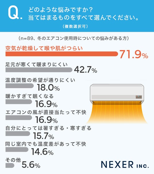 71.9%が「空気が乾燥して喉や肌がつらい」、42.7%が「足元が寒くて暖まりにくい」と回答しました。