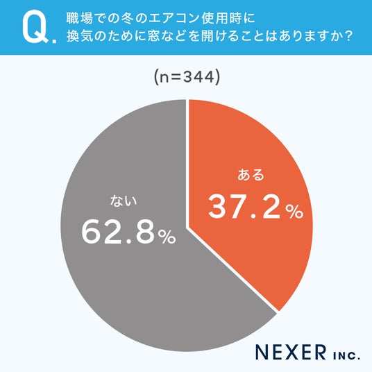 職場での冬のエアコン使用時に換気のために窓などを開けることがある会社は、37.2%でした。