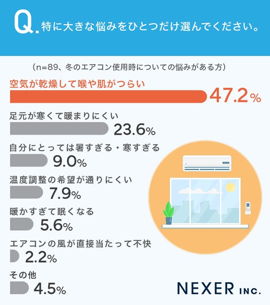 ■47.2%が、冬のエアコン使用時についての最大の悩みは「空気が乾燥して喉や肌がつらいこと」と回答
