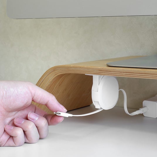 取り回ししやすい片引きの巻取り式片方のケーブルだけが伸縮するからリール部分が邪魔にならず、デスク周りや外出先など多くのシーンで活躍します。手のひらに収まるサイズにケーブルを収納できるので持ち運びにも最適。