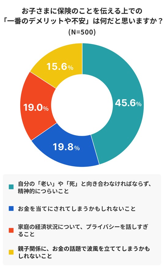 また、子どもへ伝えるうえでの一番のデメリットや不安は、「自分の『老い』や『死』と向き合わなければならず、精神的につらい」(45.6%)ことでした。「お金を当てにされる不安」(19.8%)よりも、「自身の死」を直視することへの負担から、自分はまだ元気だから話すタイミングではないと先延ばしにしているのかもしれません。