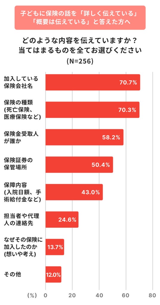 子どもに保険について「詳しく伝えている」「概要は伝えている」と回答した親でも、話している内容を尋ねると偏りがありました。 「保険会社名」や「保険の種類」は約7割が伝えているものの、いざ手続きをする際に必要となる「保険証券の保管場所」を伝えているのは約5割、「代理店の連絡先」に至っては2割台にとどまりました。