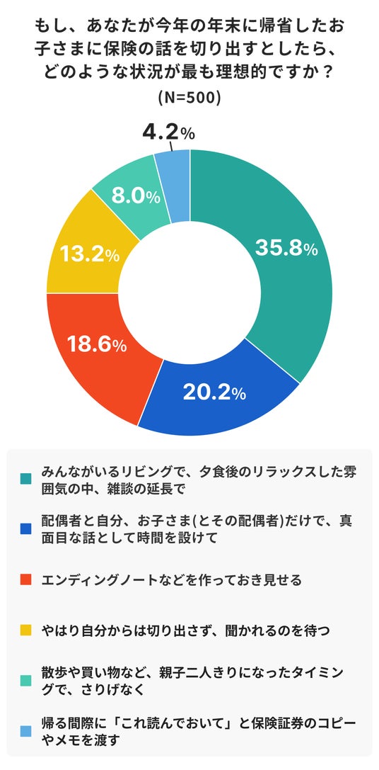 理想の切り出し方は、「改まって時間を設ける」(20.2%)よりも、「リビングで、夕食後のリラックスした雰囲気の中、雑談の延長で」(35.8%)が最多でした。