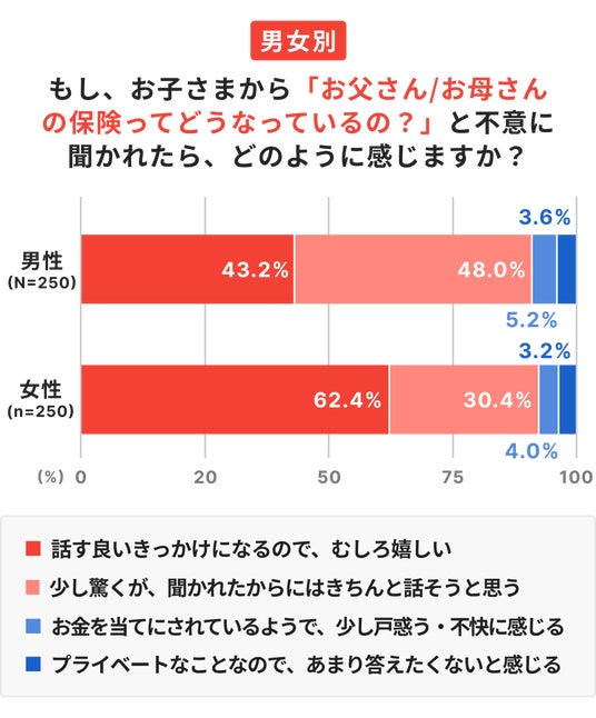 「もし子どもから『保険どうなってるの?』と聞かれたらどう感じるか」という問いに対し、「話す良いきっかけになるので、むしろ嬉しい」(52.8%)、「きちんと話そうと思う」(39.2%)を合わせ、92.0%がポジティブな回答をしました。