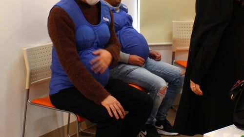 4.マタニティジャケット着用体験妊娠8~9か月の重さを再現したジャケットを着用し、足元の見えにくさや立ち座りのしづらさを体験。実際にジャケットを着用し、マットに寝転がってみた参加者は、思うように動けないことに驚いていました。