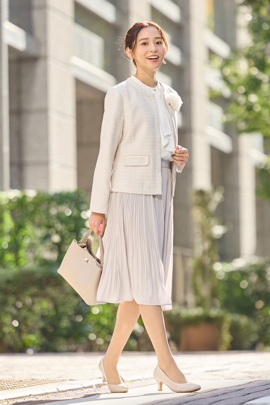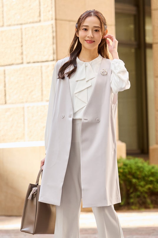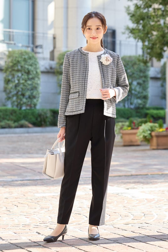 一部のアイテムには、伸びがよくシワになりにくい素材や、家庭で洗えるウォッシャブル仕様などを取り入れています。ジャケットはノーカラーやテーラード、ツイード調などのデザインから選べるため、自分の好みや体型、シーンに合わせて組み合わせがしやすいのもポイントです。